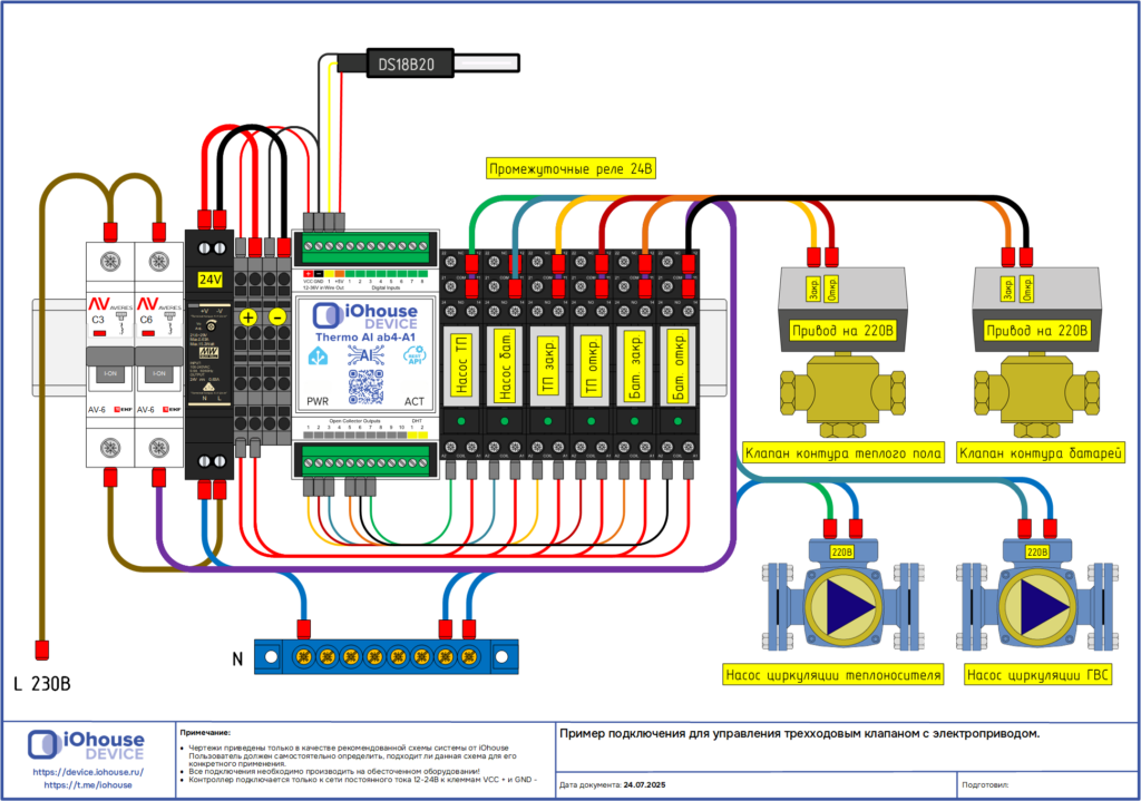 Реле открытия привода трёхходового клапана → выход №6